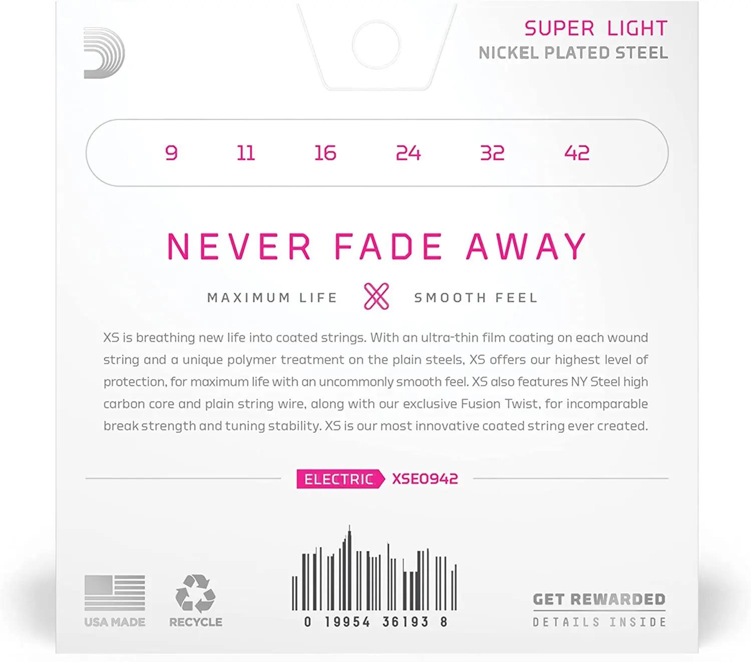 Струны XS Nickel, с сердечником из стали NY, переформулированной никелированной стальной оплеткой, изготовленные с использованием технологии Fusion Twist, отличаются превосходной прочностью, стабильностью настройки, а также более богатыми гармониками, большей ясностью и поразительной четкостью при каждом касании, слайде и бэнде.