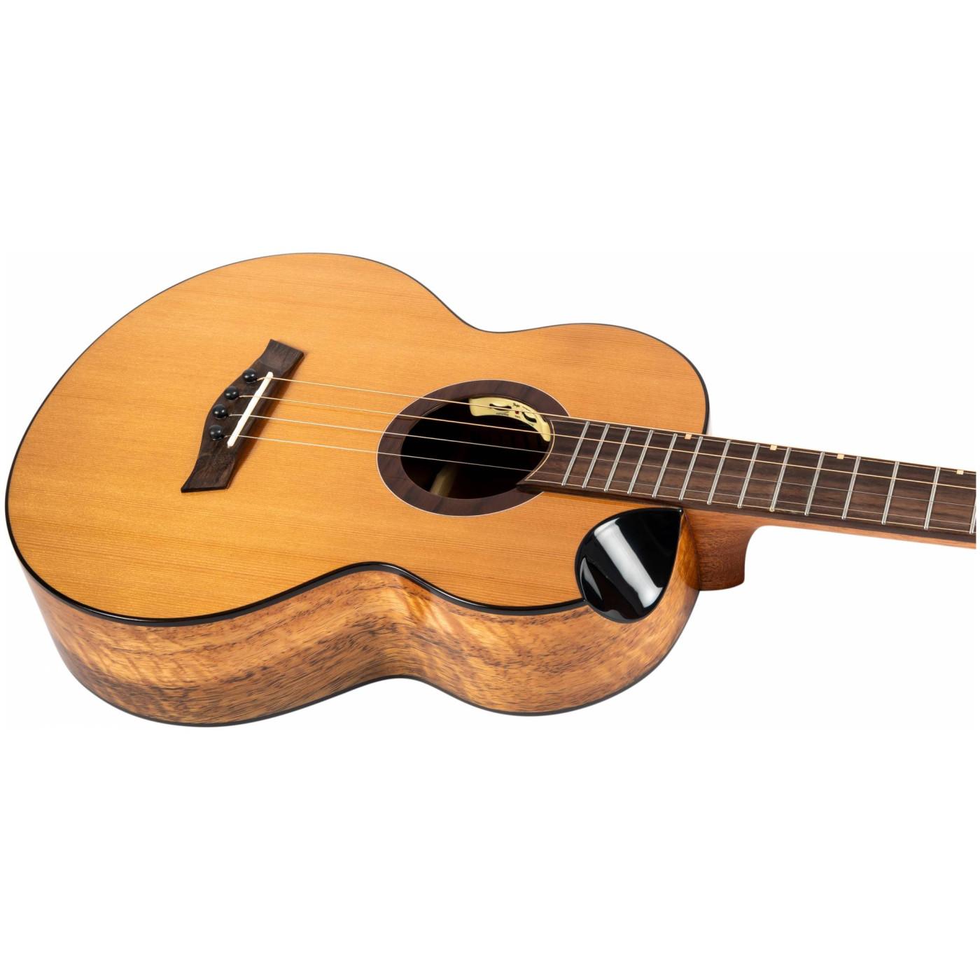На FLIGHT LILY Baritone EQ-A глянцевый черный scalloped cutaway — фирменный элемент моделей Spirit, Mustang и Victoria. Этот продуманный дизайн обеспечивает удобный доступ к верхним ладам без потери громкости и тембра, характерной для обычных катвеев. А еще он демонстрирует высочайшее мастерство лютье FLIGHT!