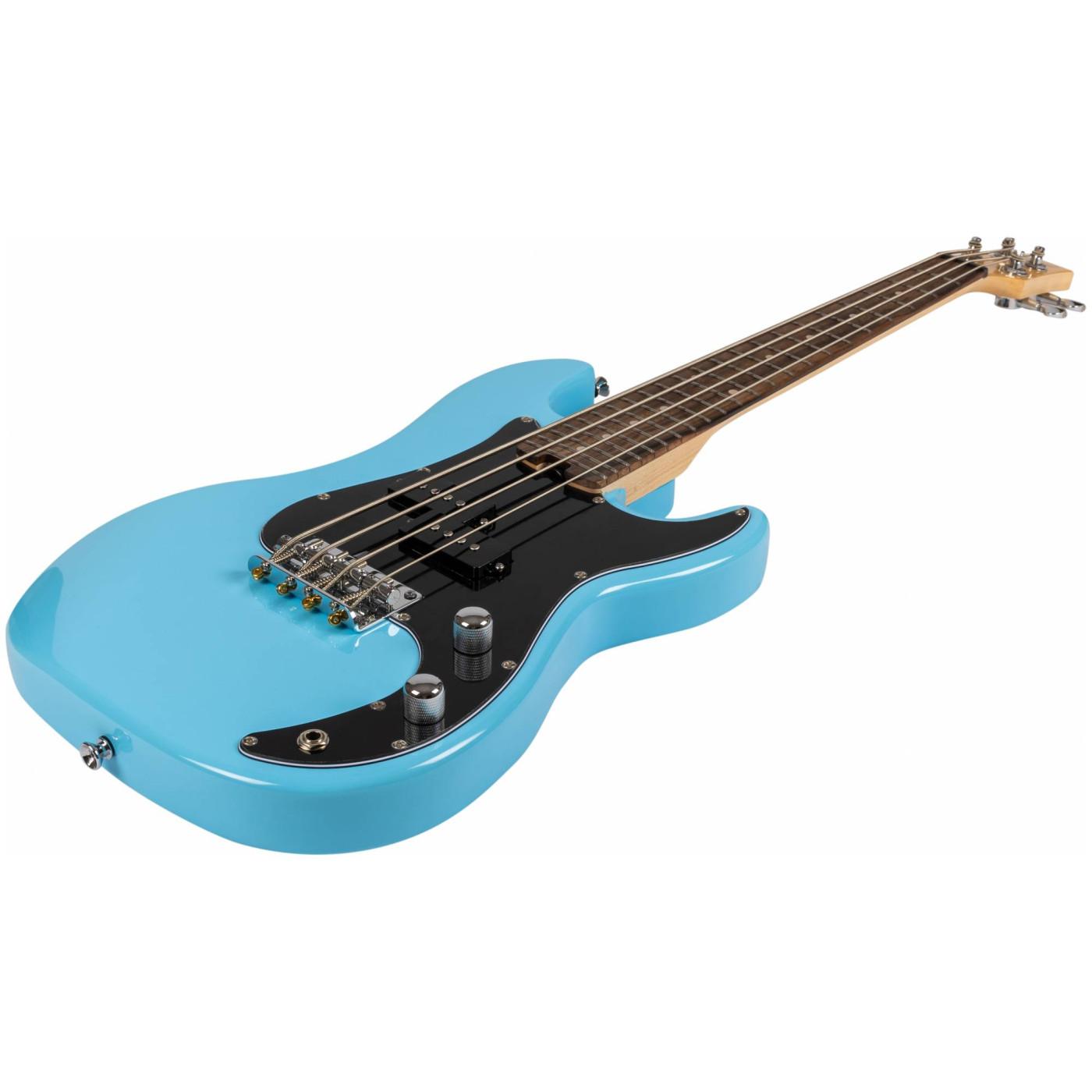FLIGHT Mini Bass Lite BL — миниатюрная, но мощная бас-гитара, в голубом цвете, которая идеально подходит для гастролирующих музыкантов. Несмотря на компактный размер (мензура 23" / 595 мм), инструмент сохраняет стандартный строй (EADG) и обладает насыщенным, чётким звучанием благодаря датчикам Alnico 5 и корпусу из тополя.