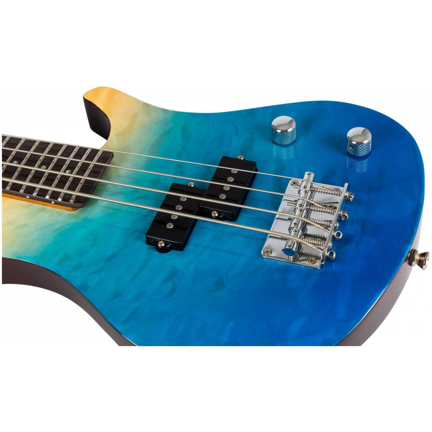 Верхняя дека Mini Bass TBL выполнена из волнистого клёна и украшена потрясающим синим градиентом, в результате получился великолепный инструмент, напоминающий нам о море и песке.