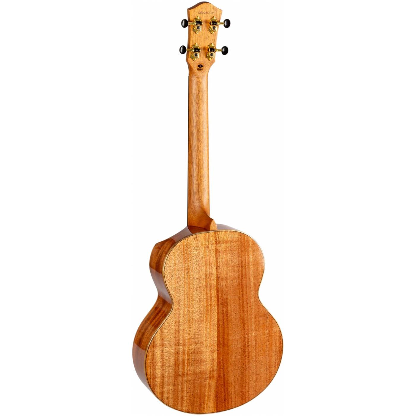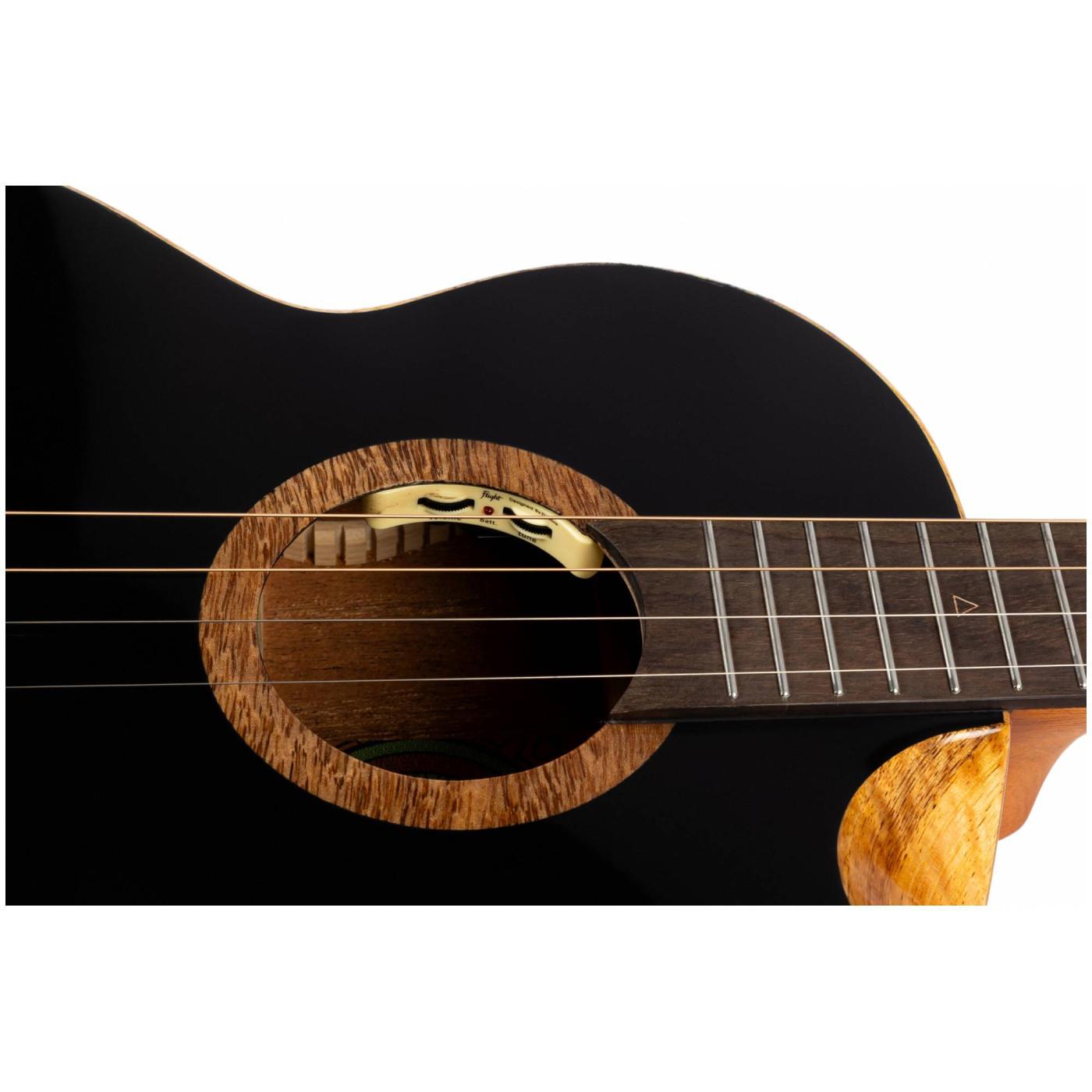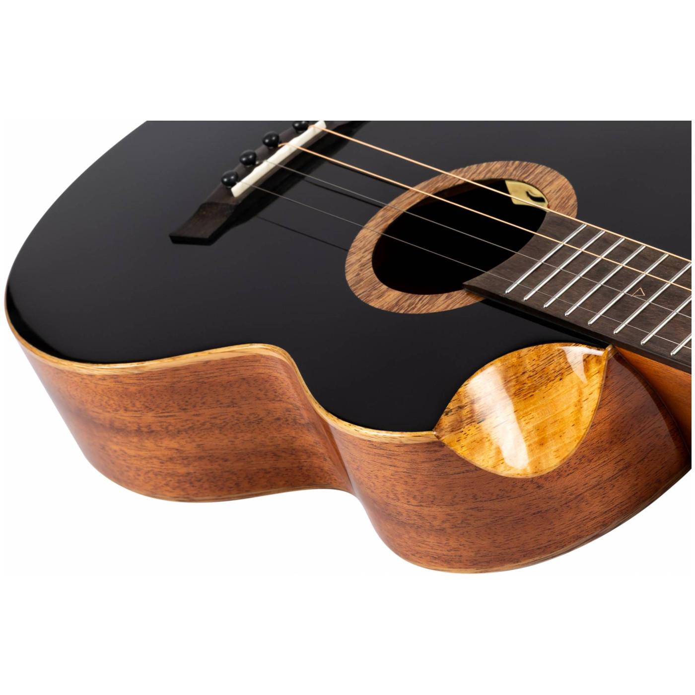 FLIGHT NORA Baritone EQ-A глянцевый черный scalloped cutaway выполненный из манго — фирменный элемент моделей Spirit, Mustang и Victoria. Этот продуманный дизайн обеспечивает удобный доступ к верхним ладам без потери громкости и тембра, характерной для обычных катвеев. А еще он демонстрирует высочайшее мастерство лютье FLIGHT!
