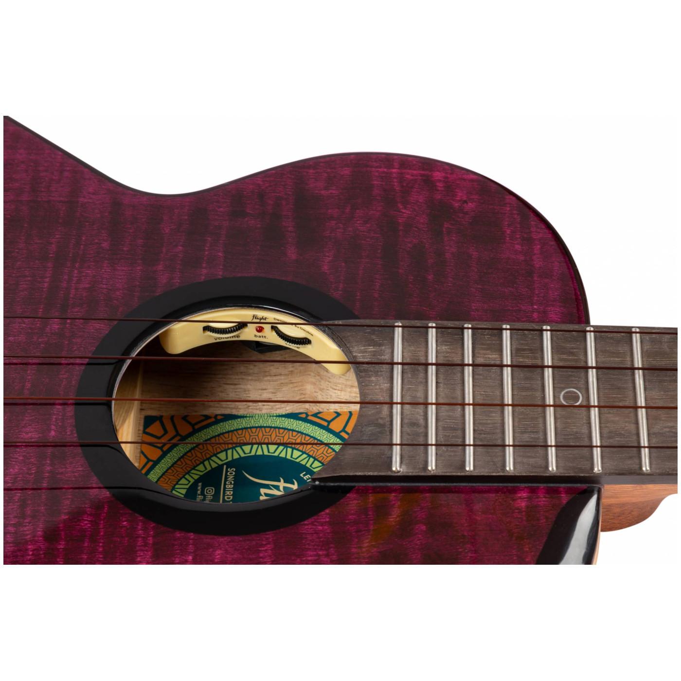 Flight Songbird — это красивая фиолетовая укулеле из цельного дерева с топом из массива огненного клёна, нижней декой и обечайкой из массива манго. Благодаря тонкому корпусу её удобно держать, удобно брать с собой в поездки, и при этом она не идёт на компромиссы в плане звучания. Манго обладает тёплым, резонансным и насыщенным звучанием с отличным сустейном, который часто сравнивают с коа. В сочетании с топом из огненного клёна Songbird звучит невероятно ярко и сладко!