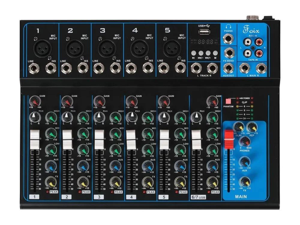 7-канальный микшерный пульт с двумя стереоканалами и отдельным стереоканалом магнитофона.