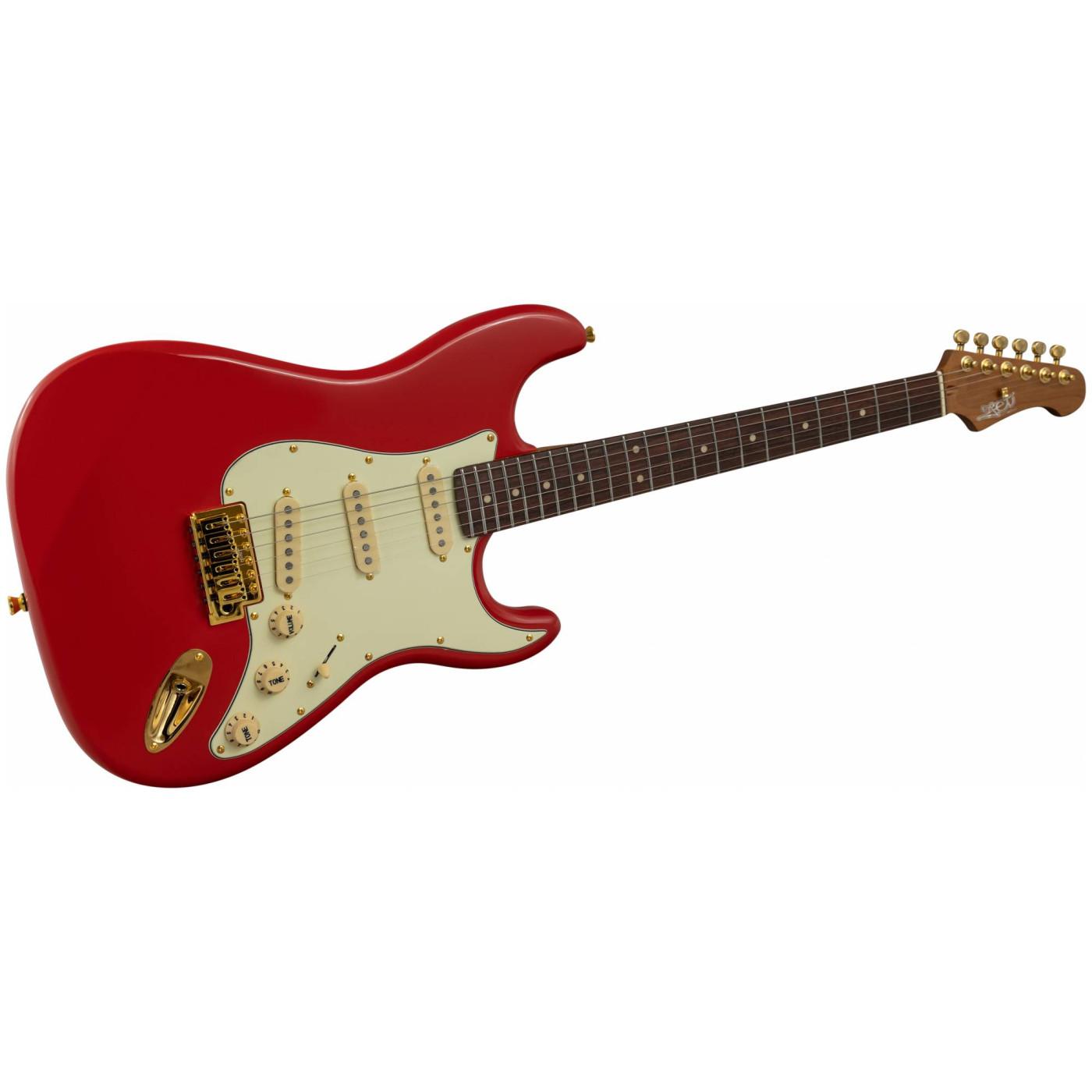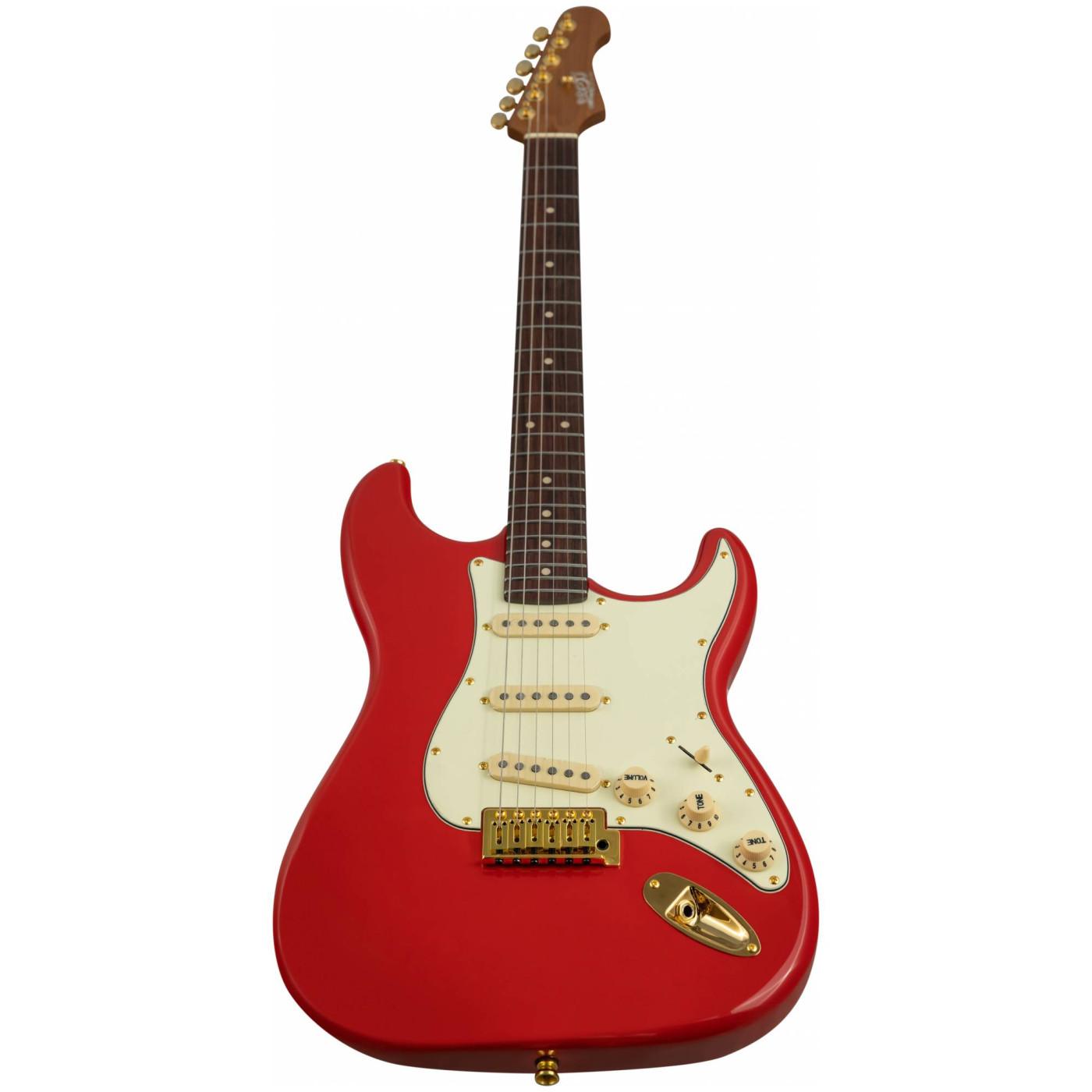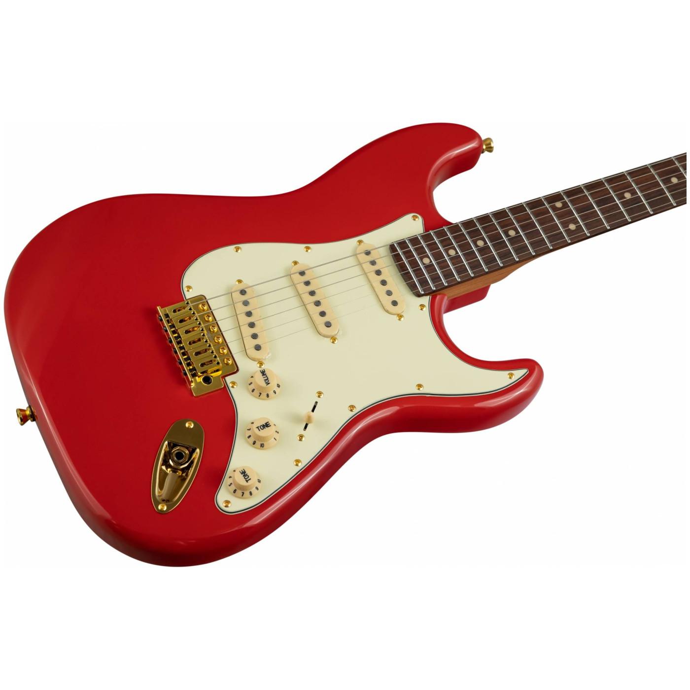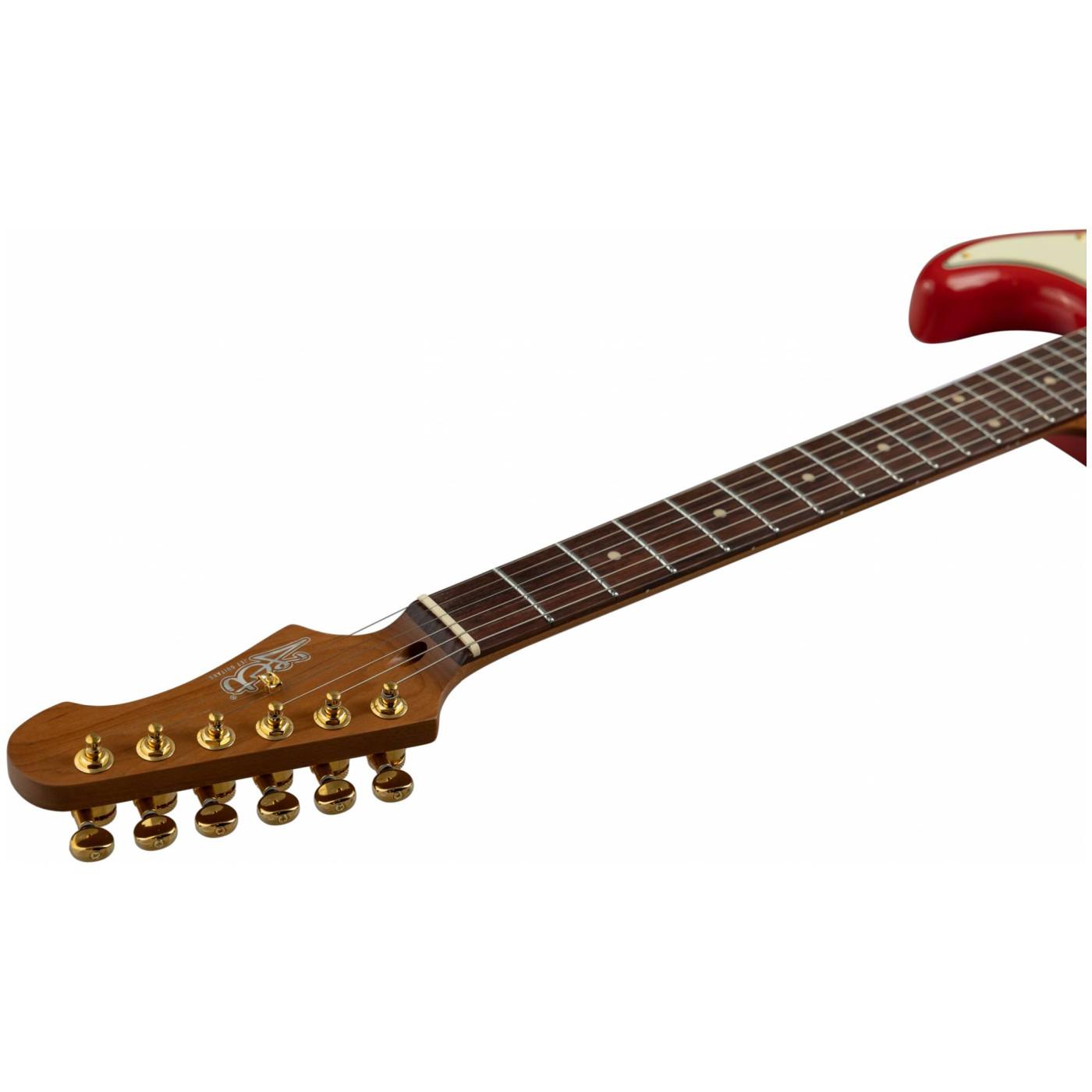 Накладка на гриф выполнена из палисандра с винтажными маркерами Clay Dots, локовые колки, золотая фурнитура и тремоло, звукосниматели SSS Alnico кремового цвета, накладка и ручки управления кремового цвета – в JET JS-380 RD G все продумано до мелочей.