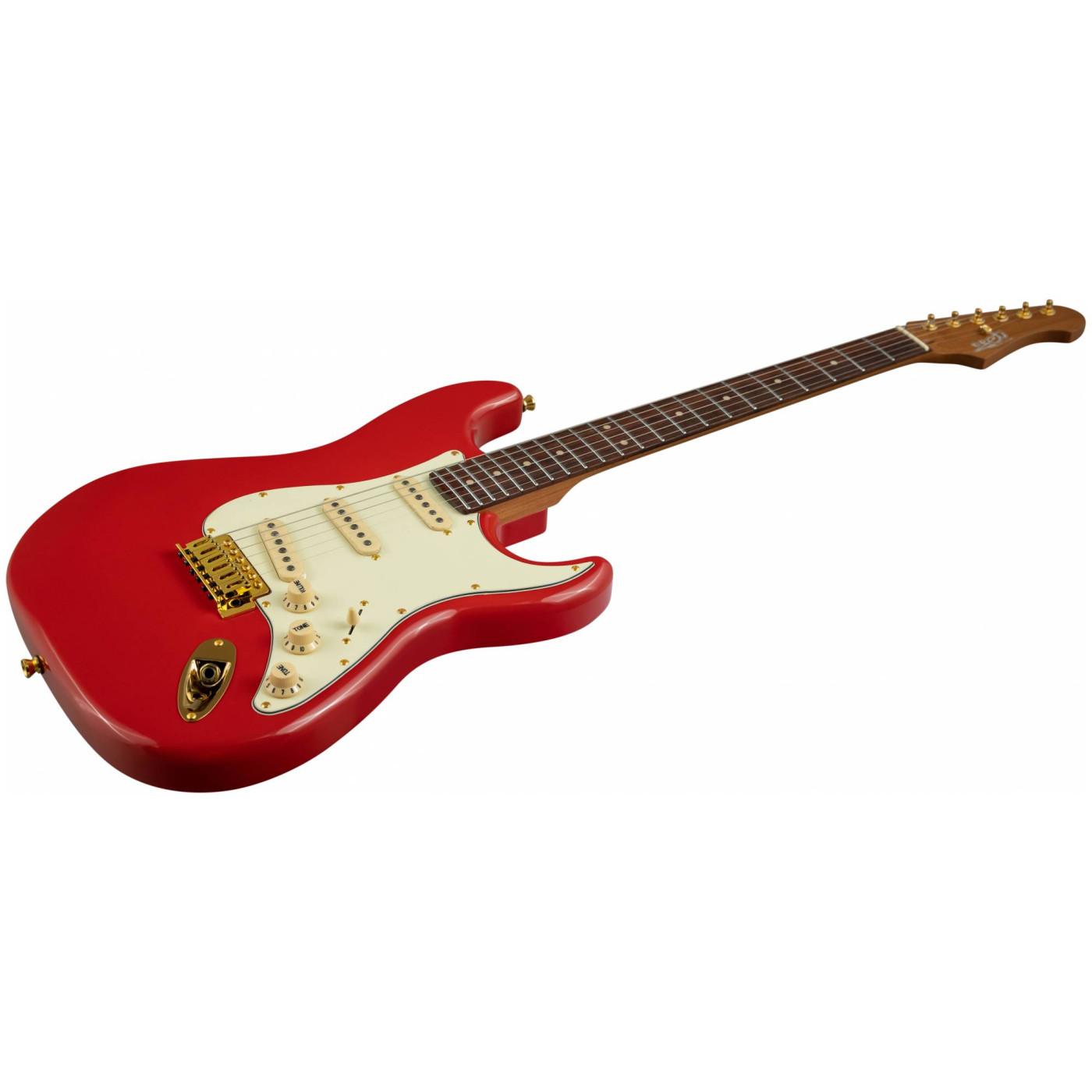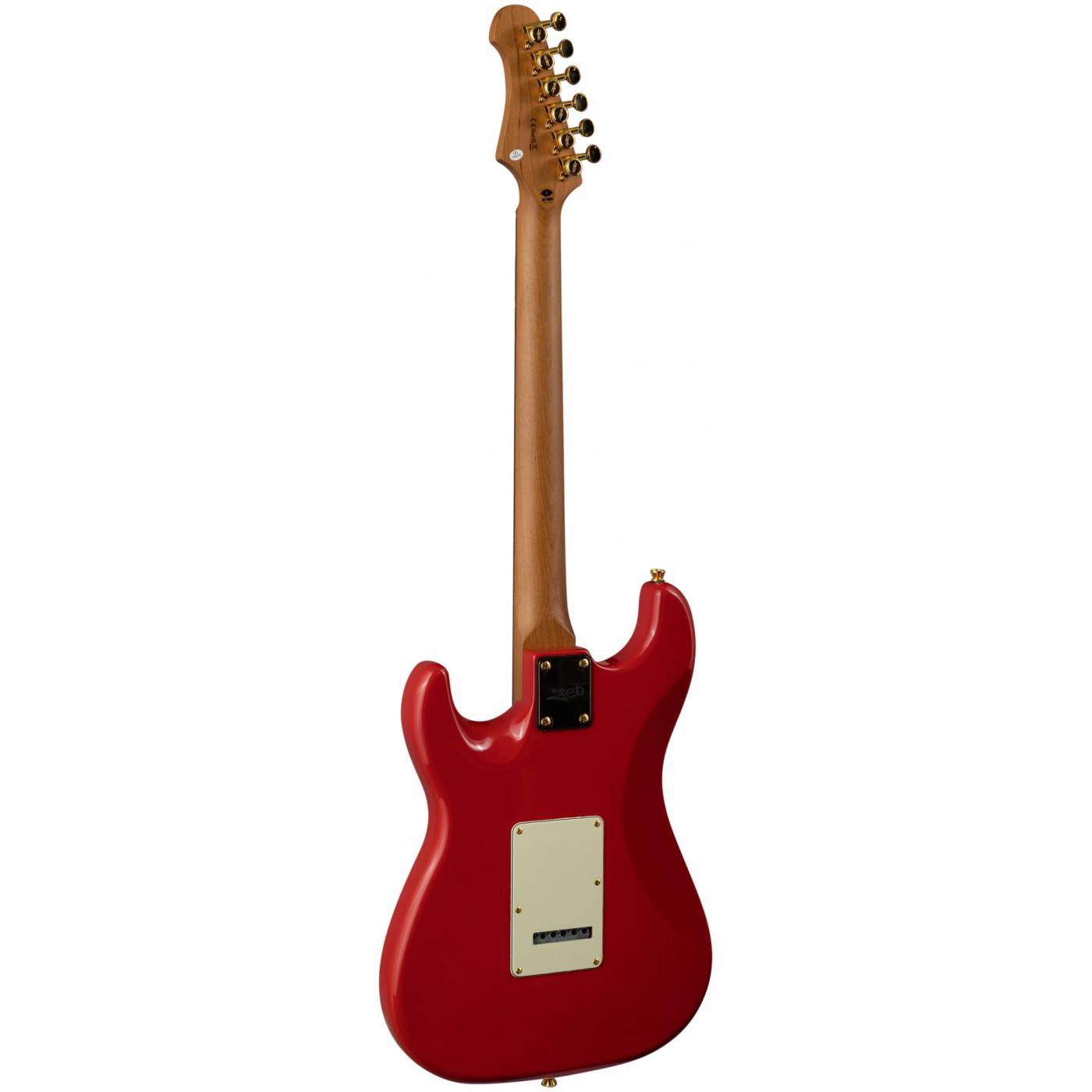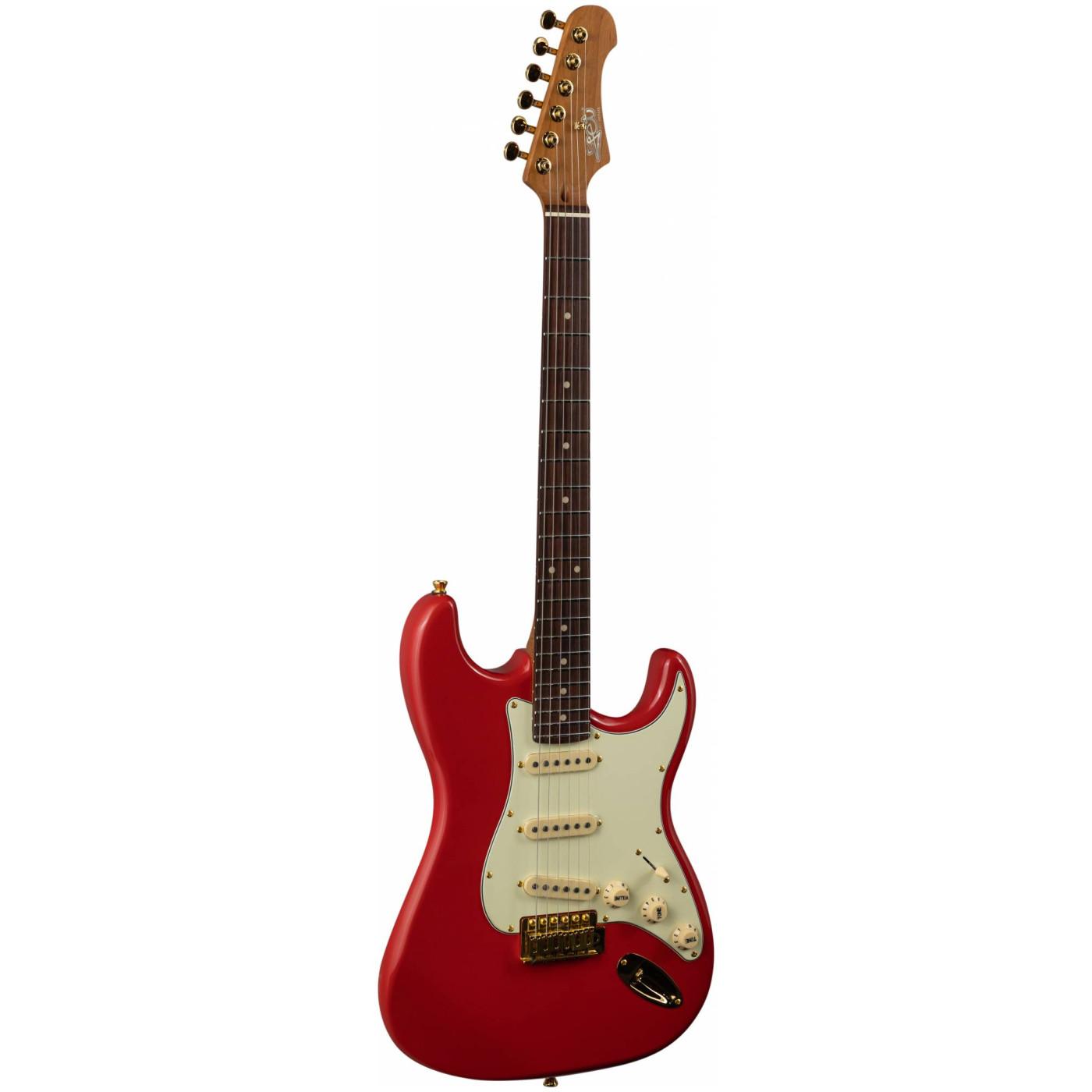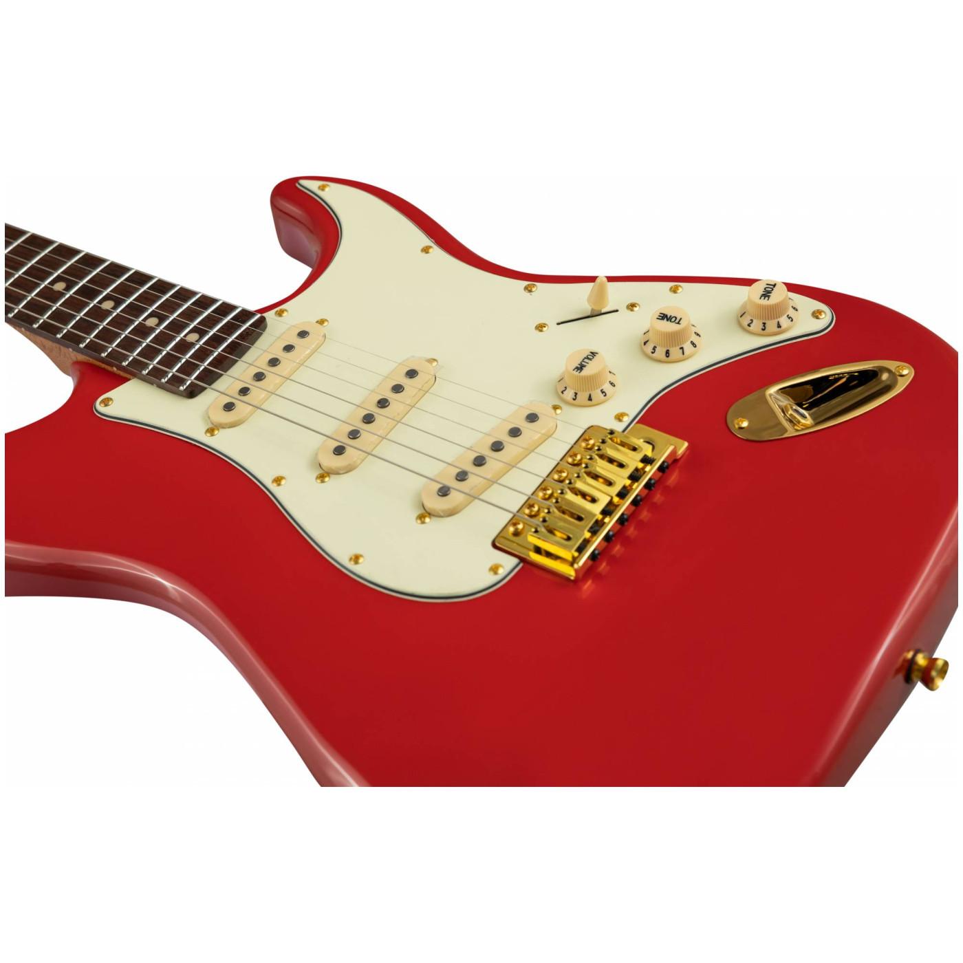 Накладка на гриф выполнена из палисандра с винтажными маркерами Clay Dots, локовые колки, золотая фурнитура и тремоло, звукосниматели SSS Alnico кремового цвета, накладка и ручки управления кремового цвета – в JET JS-380 RD G все продумано до мелочей.