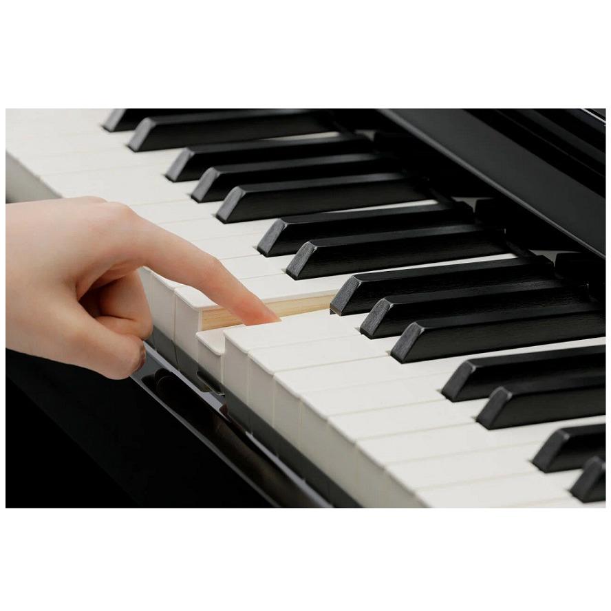 Все восемьдесят восемь черно-белых клавиш полностью изготовлены из длинных кусков дерева с тонко текстурированными поверхностями цвета слоновой кости и черного дерева, которые впитывают влагу и облегчают контроль. Каждая деревянная клавиша плавно поворачивается на балансировочном штифте – концы поднимаются и опускаются, повторяя знакомое движение "качелей" при игре на акустическом пианино. При нажатии задняя часть клавиши поднимается, приводя в действие утяжеленный молоток для удара по реле давления. Затем измеряется величина усилия, приложенного к этому переключателю, и соответствующая нота воспроизводится с аутентичным тональным характером и громкостью.