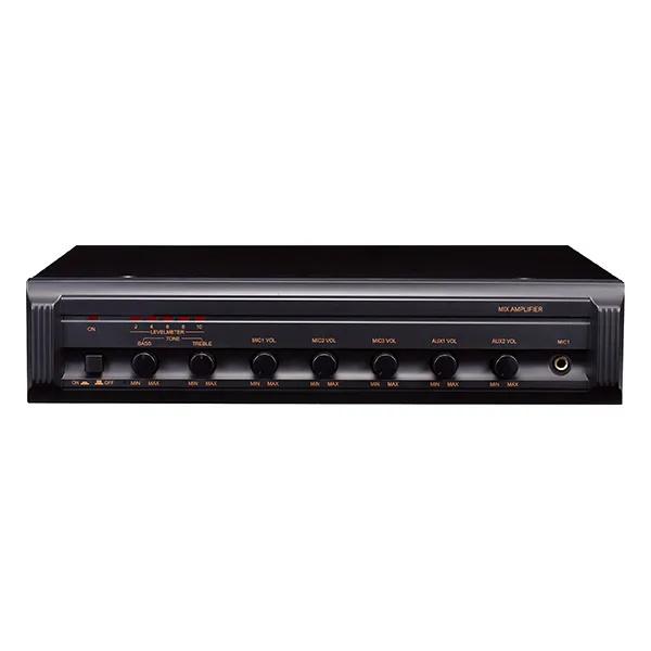 Трансляционный усилитель с 3 микрофонными входами и 2 линейными входами, 1 микрофонный вход имеет функцию приоритета и отключения звука. Предусмотрены регуляторы низких и высоких частот и регулятор мастер громкости. Отдельные регуляторы громкости для каждого входа.