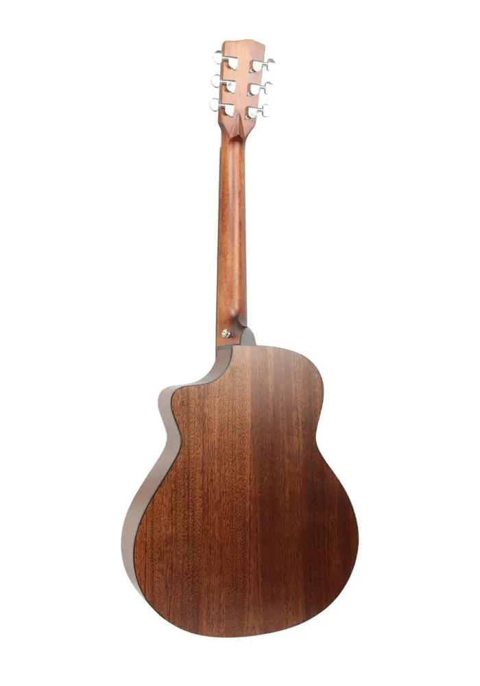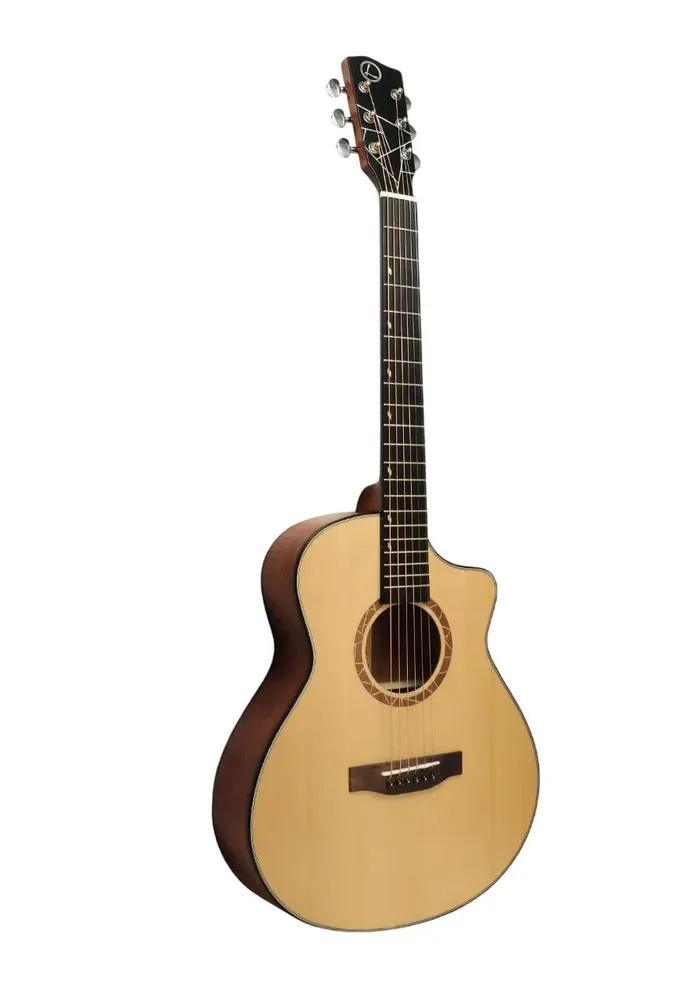 Верхняя дека из ели обладает отличным резонансом и чётким, ярким звучанием. Нижняя дека и обечайки из красного дерева придают звуку теплоты и мягкости. Палисандровый бридж обеспечивает превосходную стабильность и хорошую звукопередачу. Накладка грифа из амаранта износостойкая и приятная на ощупь. Матовая отделка и детали демонстрируют качество и стиль.