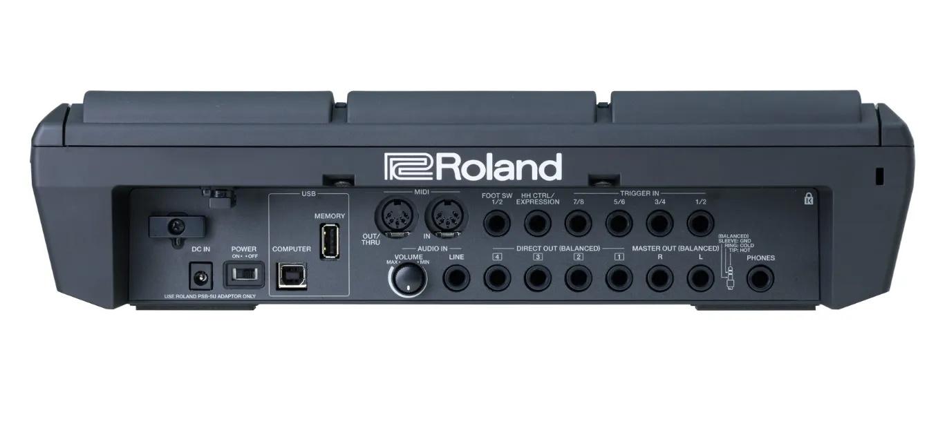 Коммутационные возможности включают порт USB, разъёмы MIDI I/O, парный TRS (L/R) выход, четыре назначаемых TRS моно-выхода, один TRS выход для наушников, четыре двойных триггерных TRS входа и специальный вход управления с поддержкой контроллера хай-хэта Roland и педали экспрессии.